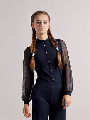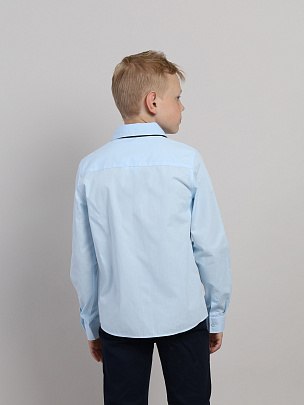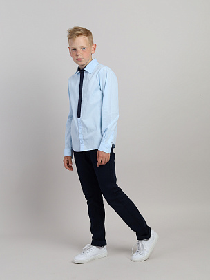 Рубашка классическая, полуприталенного силуэта, с длинным рукавом рубашечного покроя, с притачными манжетами, с застегивающейся шлицей рукава. Воротник обтачной с притачной стойкой. На центральной застежке расположена декоративная вставка в виде галстука.