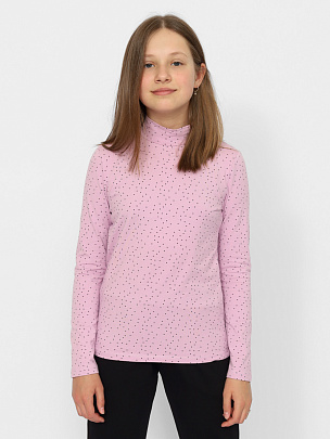 Джемпер для девочки с короткими рукавами, свободного силуэта, спущенным плечом и отложным воротником. Сзади застежка на пуговицу. Спереди декорирован металлическим лейблом.
