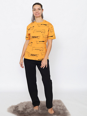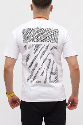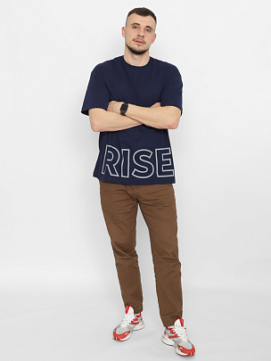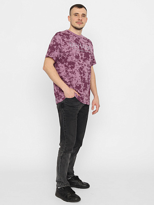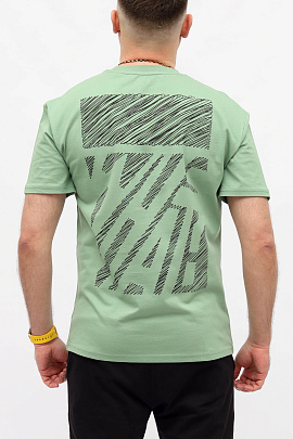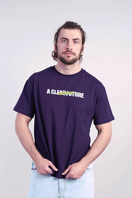 Футболка oversize со спущенным плечом, с коротким рукавом. Горловина круглая, обработана притачной бейкой из рибаны с лакрой. Плечевые швы смещены на перед и отстрочены. По переду вдоль правого бокового шва - текстовый принт.